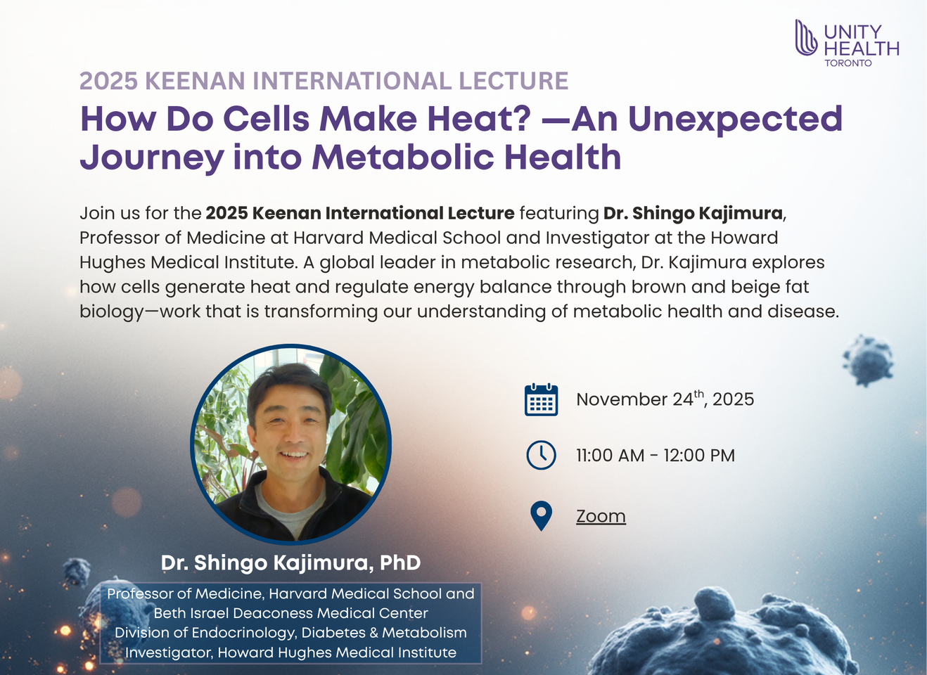 Join us on November 24 for the 2025 Keenan International Lecture from 11:00 to 12:00 PM over Zoom, featuring Dr. Shingo Kajimura, Professor of Medicine at Harvard Medical School and Investigator at the Howard Hughes Medical Institute. He will be presenting "How Do Cells Make Heat? —An Unexpected Journey into Metabolic Health".