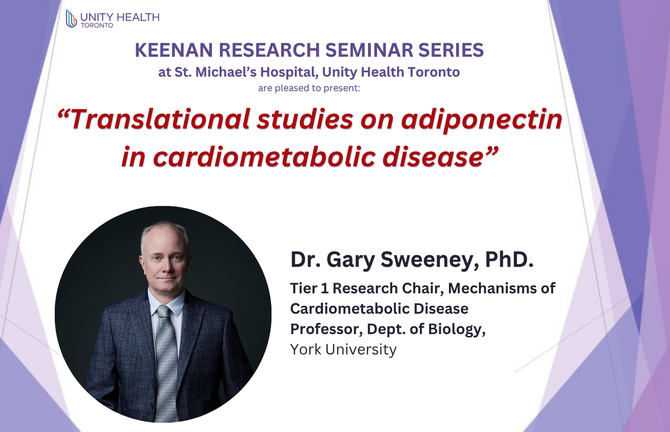 Join us on November 21 from 1:00 to 2:00 PM in the LKS Auditorium at the Li Ka Shing Knowledge Institute for a captivating lecture by Dr. Gary Sweeney, Tier 1 Research Chair in Mechanisms of Cardiometabolic Disease and Professor in the Department of Biology at York University. He will present “Translational studies on adiponectin in cardiometabolic disease.” Don’t miss this opportunity to hear from a leading expert in cardiometabolic research.
