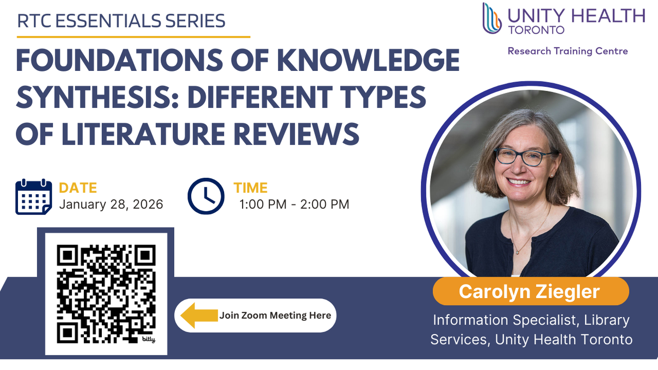 Join the Research Training Centre Essentials Series to hear from Carolyn Ziegler, Information Specialist, Library Services, Unity Health Toronto.