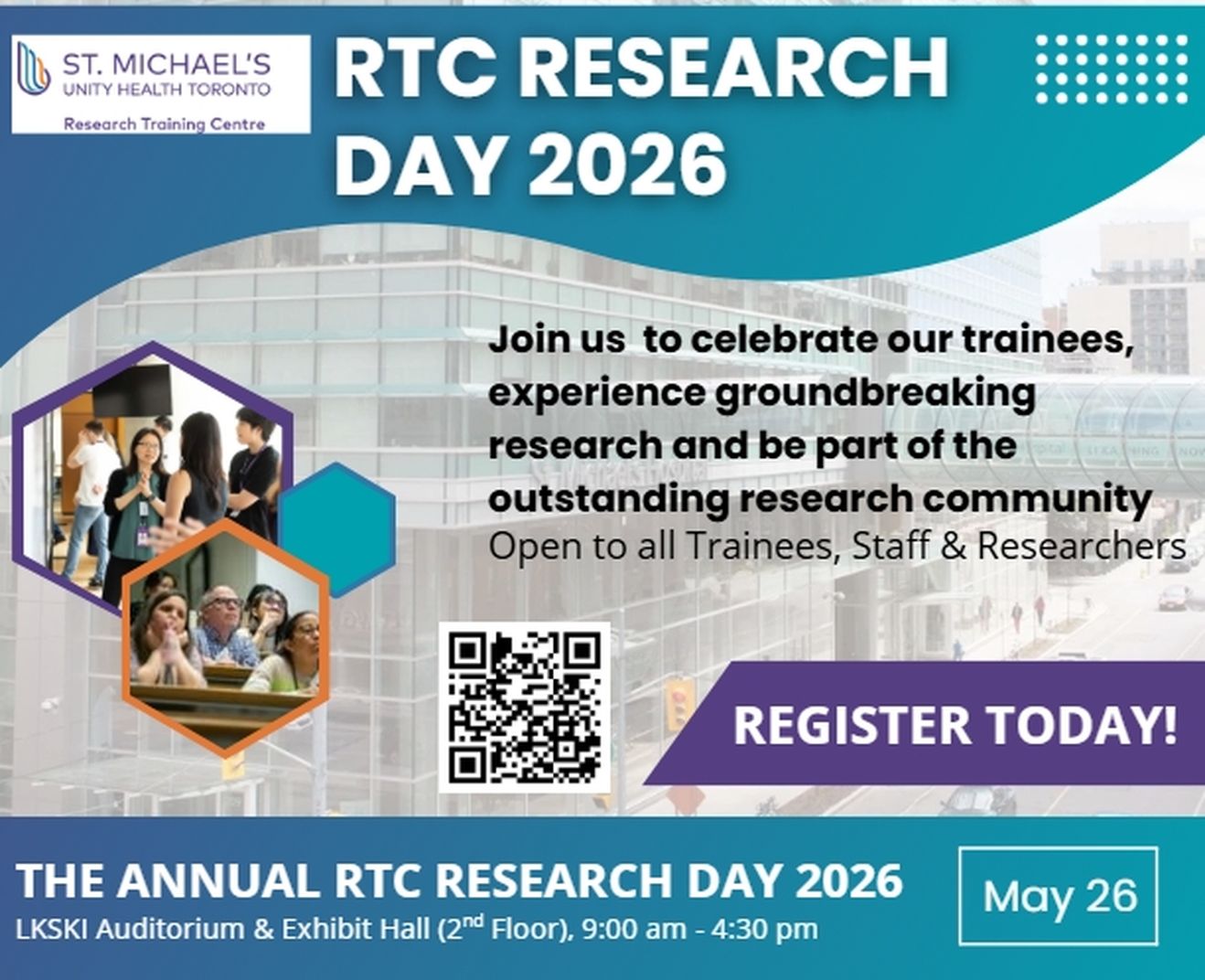 Save the date to attend the annual RTC Trainee Research Day on May 26, 2026, to support the annual celebration of the graduate students and postdoctoral researchers' innovative research findings!